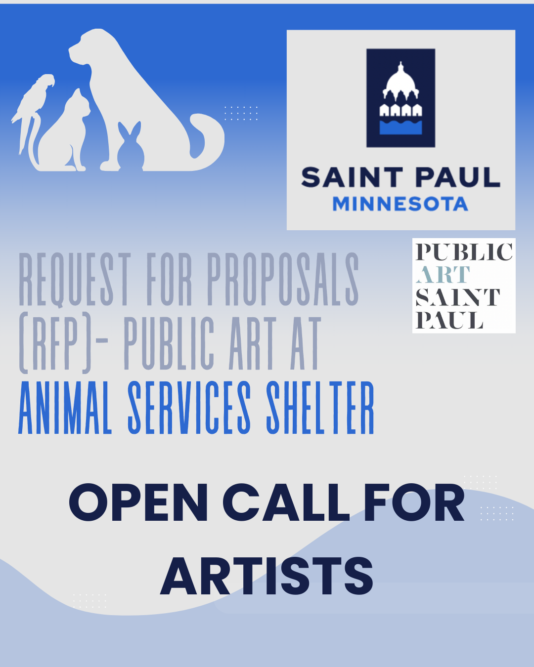 The City of Saint Paul in partnership with Public Art Saint Paul is pleased to invite artists and artist teams to submit proposals for a site-specific public art installation at a new animal services shelter facility located at 1115 Beulah Lane. Proposals are encouraged to be welcoming, inspiring, and resonate with both the animal services shelter’s mission and the public. NOTE: you do not have to be a public artist to qualify other than being capable of pulling fabricators and contractors together to realize your vision.